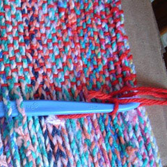 woven sample below show are weaving different colors of yarn, optically mix to create a color blend. This optical mix contrast was also called broken colors by the Impressionist painters as, for example, green is made by breaking yellow & blue or as in this case on the right, red & blue are broken creating an optical mix of violet. |