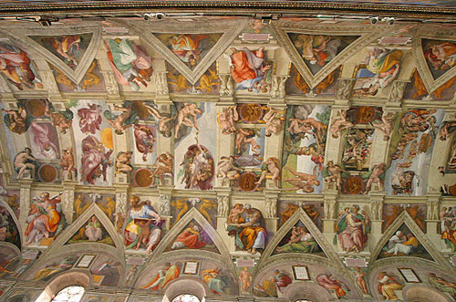 ![]() | Michelangelo di Lodovico Buonarroti Simoni Italian 1508-1512 Renaissance painter, sculptor, architect, poet, and engineer. Scenes from Genesis on the ceiling and The Last Judgment on the altar wall of the Sistine Chapel in Rome. Commissioned by Pope Julius II | ||