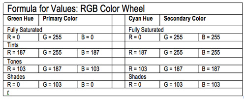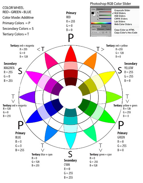 The RGB The RGB Color Wheel is based on the 3 primary colors: Red, Green and Blue (also called Indigo) RGB Color Wheel is a Additive Color Mode. In the RGB Color Picker Panel, the best way to select Values levels for the RGB Color Wheel is to use Only Web Colors. Formulas for Samples are for: